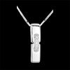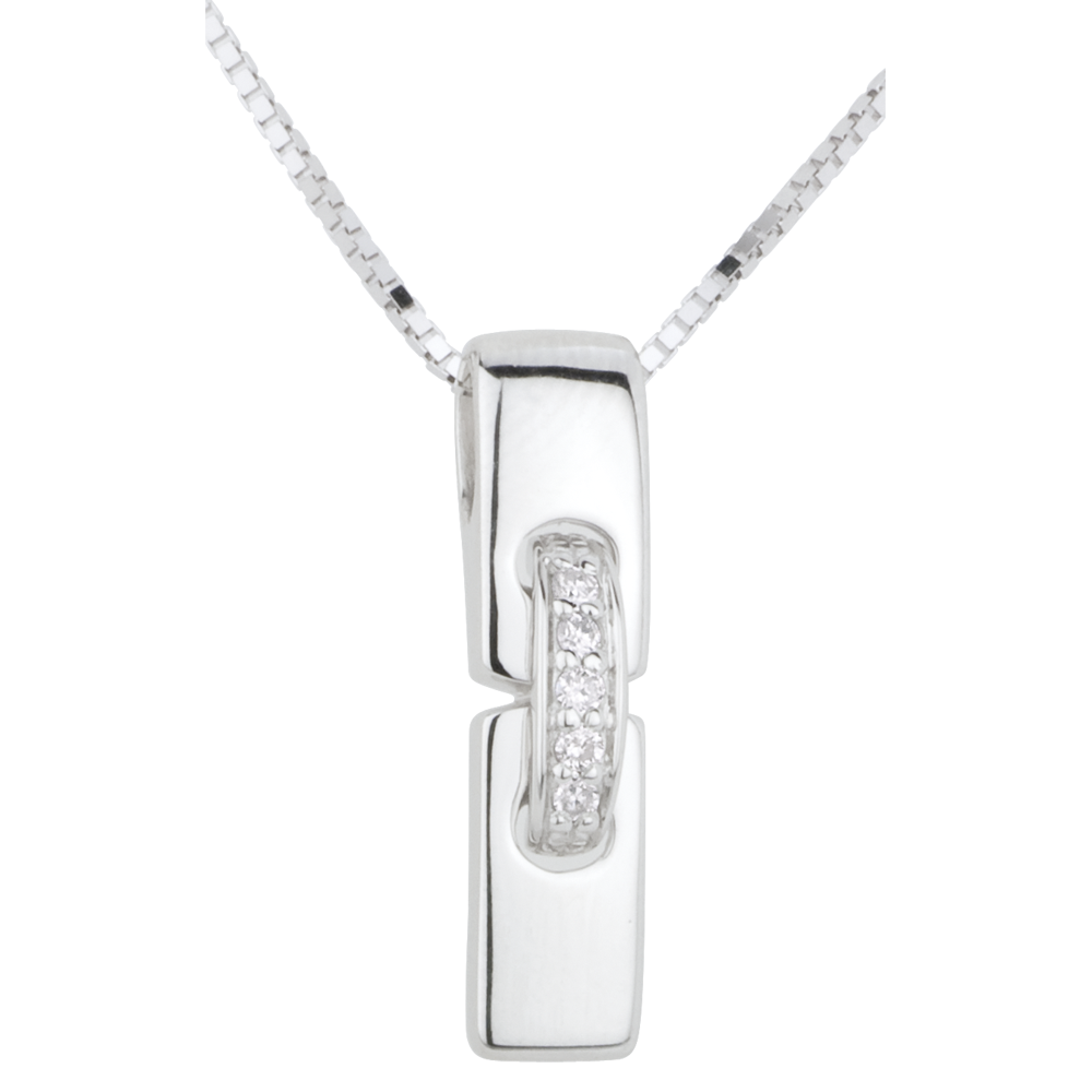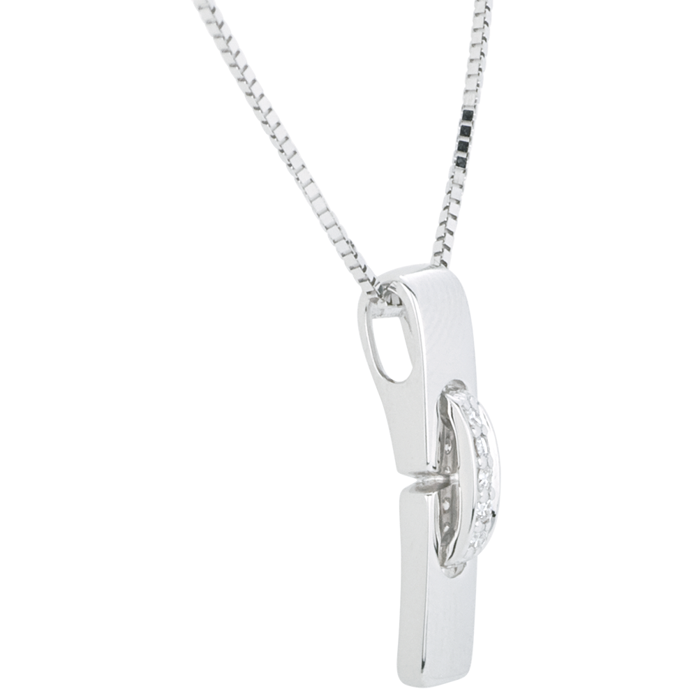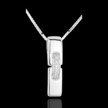 Dos parcelas de oro blanco son reunidas por un lazo de oro solado por diamantes y suspendidas de una cadena veneciana.