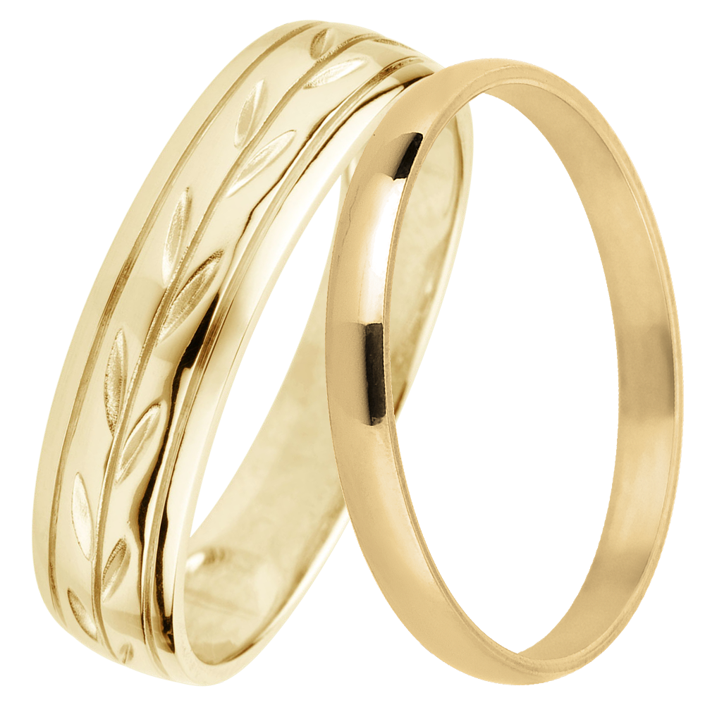 Un elegante par de alianzas para ella y él. Una alianza pulida de 2 mm para ella y una amplia alianza de oro amarillo grabada con hojas eternas para él.…
