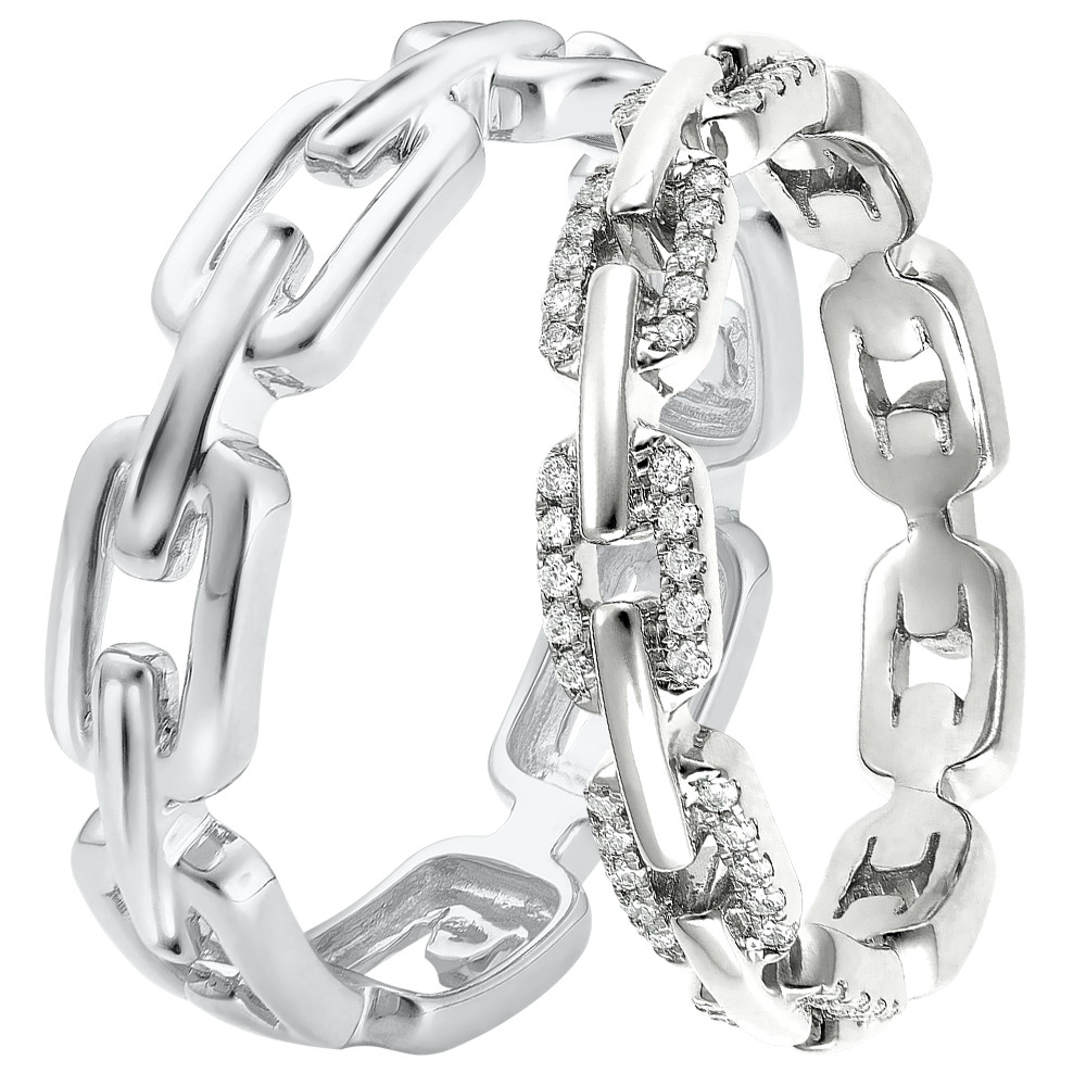 Un elegante par de alianzas en oro blanco, inspirado en el icónico diseño de eslabón cubano.Una creación atemporal que combina estilo moderno y sofisticación.