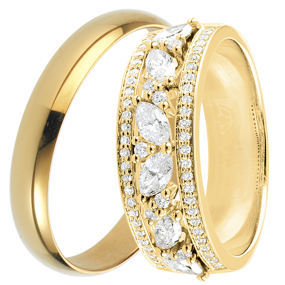 Una pareja elegante de alianzas para ella y él. Para ella, una alianza engastada con 63 diamantes talla marquesa y brillante, con un total de 0,69 quilates; para él, un anillo de oro amarillo pulido de 3,5 mm de ancho.