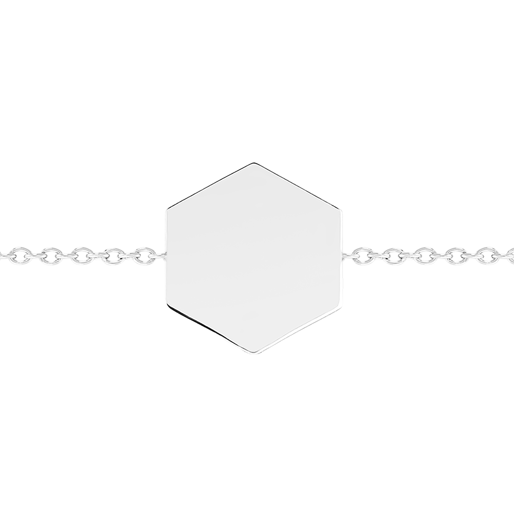 Esta pulsera cadena en oro blanco 18 quilates combina elegancia y personalización gracias a su medalla hexagonal grabable. Su diseño minimalista es ideal para cualquier ocasión.