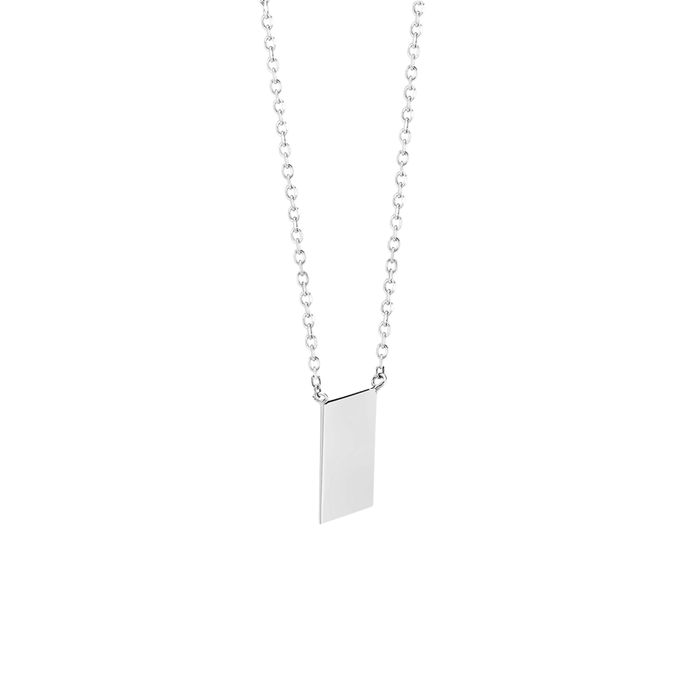 Este collar en oro blanco de 9 quilates destaca por su diseño minimalista y medalla cuadrada que se puede personalizar con grabados Edenly.
