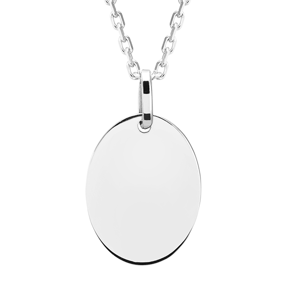Descubra esta medalla ovalada en oro blanco 9 quilates, una joya delicada y elegante para personalizar con las opciones de grabado de Edenly. Su forma fina se adapta a todos los estilos para un colgante único.