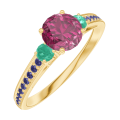 « L'ATELIER » Nº163093Anillo Oro amarillo 18 quilates - Rubí redondo 0.5 quilates - Piedras laterales Esmeralda - Engastado Zafiro azul 4.5 (16)