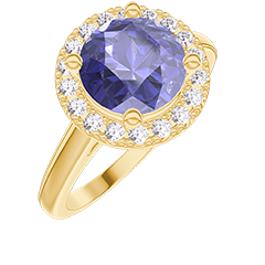 Anillo Oro amarillo 18 quilates - Zafiro azul redondo 1 quilates - Halo Diamante