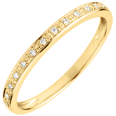 Una alianza con diamantes con engaste en grano. Elegante y atemporal para acompañar un anillo de compromiso o llevarla sola.