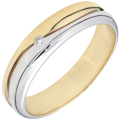 Un anillo ancho de oro blanco y oro amarillo es atravesado por una curva suave.Un diamante centelleante en el centro de la alianza.