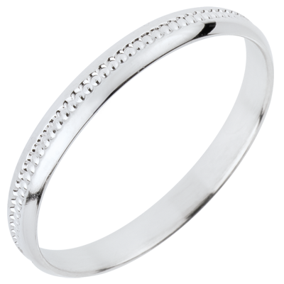 Una alianza de oro blanca trabajada para darle un máximo de brillantez.