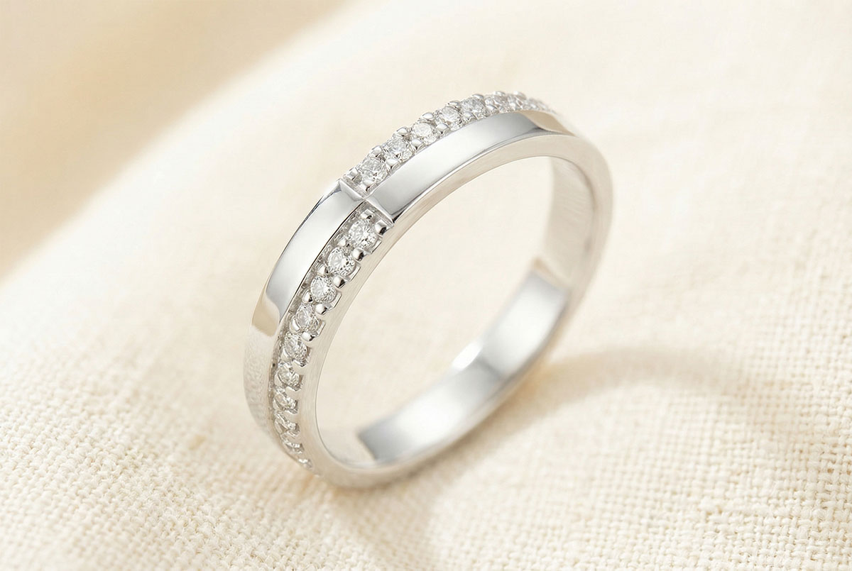 Una alianza de oro la mitad-mitad blanca diamante para un equilibrio elegante y moderno.