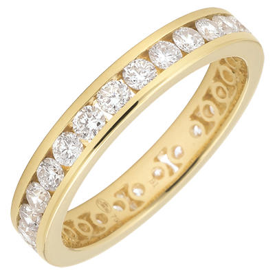 El equilibrio perfecto de un aro de oro amarillo con diamantes redondos con engaste de carril consigue transmitir un fuerte simbolismo. Una joya ineludible para sellar un enlace de excepción.