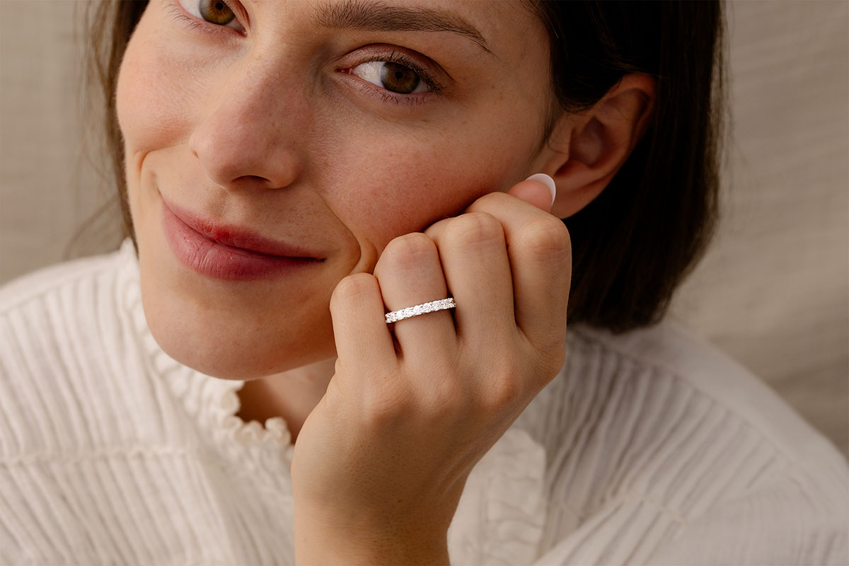 El equilibrio perfecto de un aro de oro blanco con diamantes redondos con engaste de garras consigue transmitir un fuerte simbolismo. Una joya ineludible para sellar un enlace de excepción.