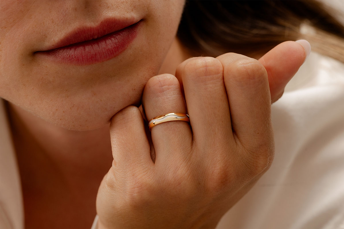 Un anillo de oro amarillo surcado por una línea sinusoidal de oro blanco.