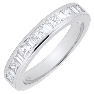 El equilibrio perfecto de un anillo de oro blanco con diamantes de forma princesa con engaste de carril consigue transmitir un fuerte simbolismo. Una joya ineludible para sellar un enlace de excepción.