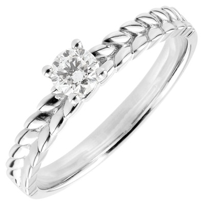 Un precioso diamente solitario que resposa sobre una montura de hojas de oro entrelazadas. Un anillo de compromiso original y refinado.