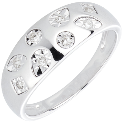 Una multitud de formas en el oro blanco como estuche para los diamantes talla brillando por este anillo.