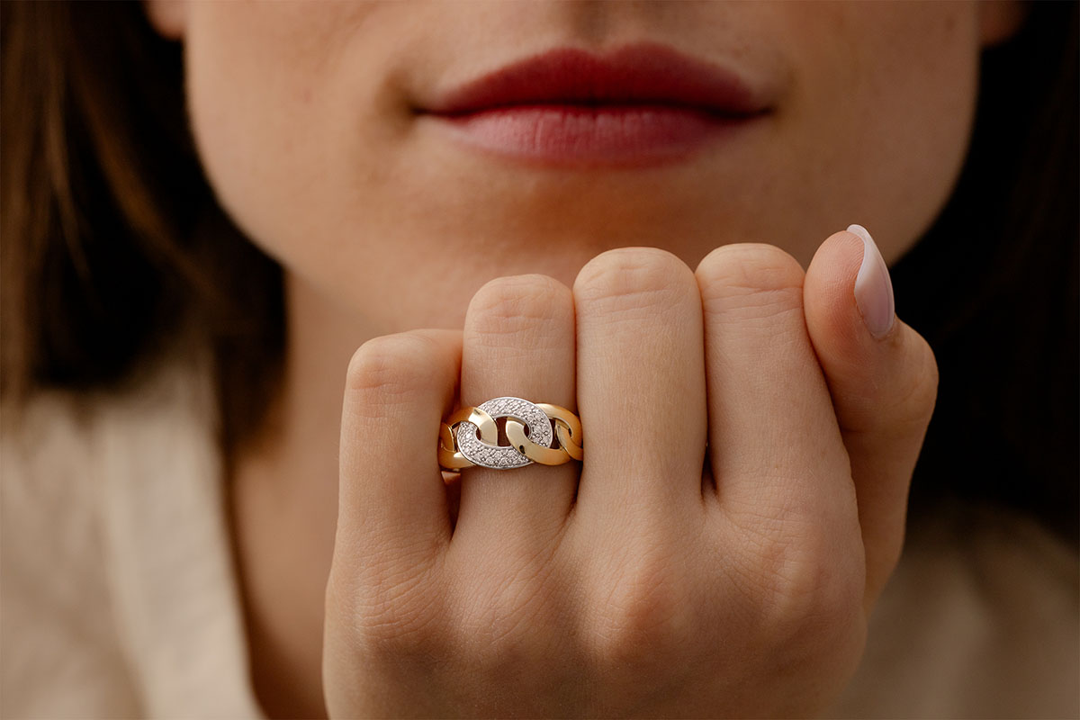 Réplica de un motivo cadenea aspa, compuesta de anillos enlazados a la vuelta de dedo.