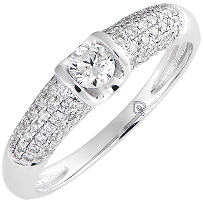 Lo sagrado de un diamante realzado por un empedrado generoso en las 3 partes de la montura. Un Anillo de compromiso completamente brillante.