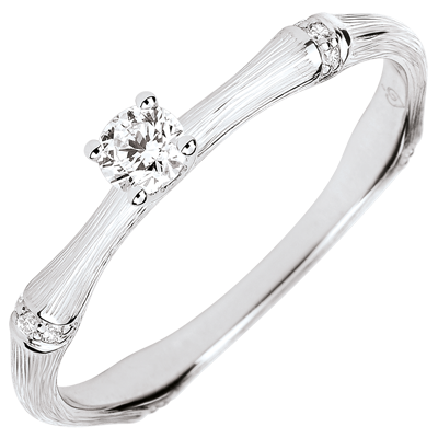 Una rama de bambú flexible y sólida se convierte en un anillo de compromiso eterno. Los nodos de bambú están incrustados de diamantes en el oro blanco rugoso para resaltar el diamante solitario. El trabajo hecho a mano del acabado mate le da un aspecto realista y natural.