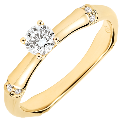 Una rama de bambú flexible y sólida se convierte en un anillo de compromiso eterno. Los nodos de bambú están incrustados de diamantes en el oro amarillo para resaltar el diamante solitario.