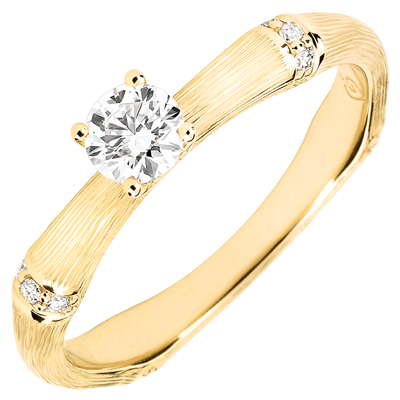 Una rama de bambú flexible y sólida se convierte en un anillo de compromiso eterno. Los nodos de bambú están incrustados de diamantes en el oro amarillo rugoso para resaltar el diamante solitario. El trabajo hecho a mano del acabado mate le da un aspecto realista y natural.