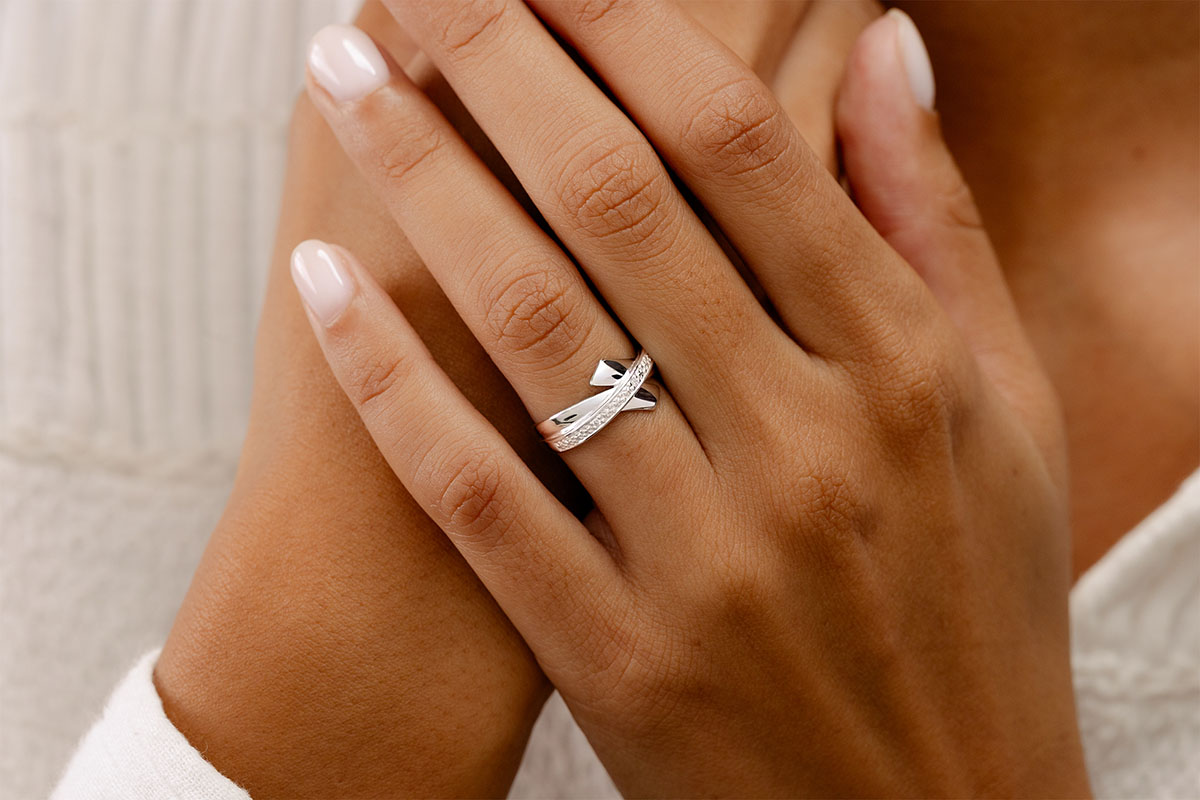 Un anillo de oro blanco y diamantes que recuerdan un brazalete consagrado para momentos ensorcellés.