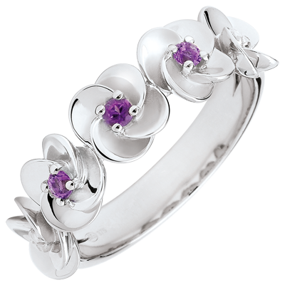 En una corona de flores resplandecientes, los pétalos se abren sobre un corazón de ametista, capturando un momento para la eternidad. . Podrá ser llevada como una sortija o como una alianza excepcional.