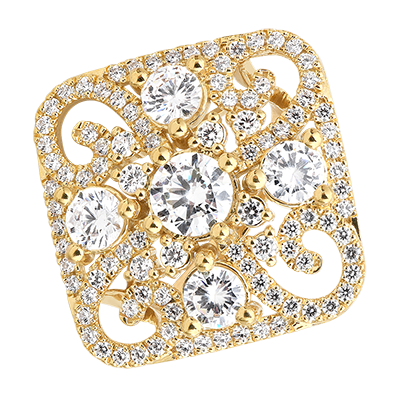Una joya majestuosa y trabajada con esmero: el anillo Eléandra en oro amarillo reciclado enmarca un diamante sintético central, rodeado de volutas engastadas y piedras brillantes.Su motivo geométrico de inspiración barroca irradia 3,78 quilates de luz.Una pieza impactante, escultórica y sumamente preciosa.