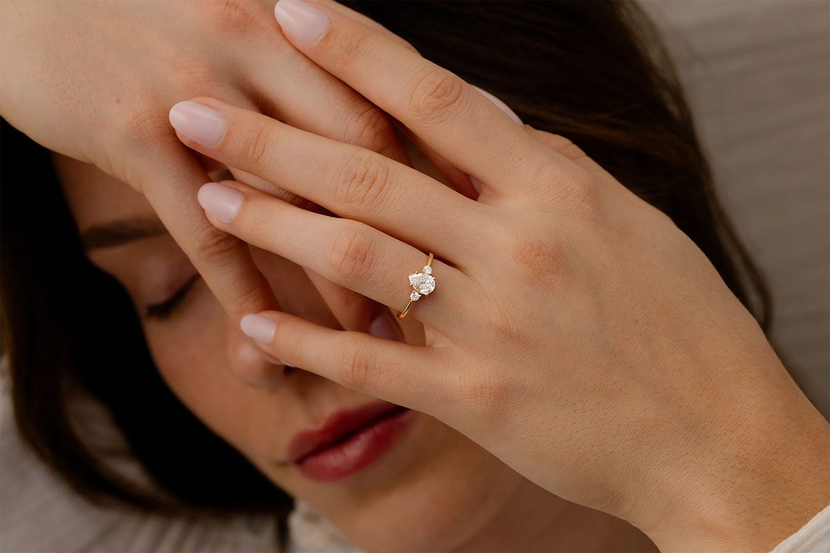 Diamante talla pera de 0,5 quilates, acompañado de dos diamantes redondos brillantes.Una sortija luminosa y equilibrada, de elegancia clásica realzada con un toque contemporáneo.