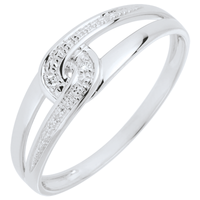 Dos rizos de oro blanco se entremezclan y se unen alrededor de los diamantes.