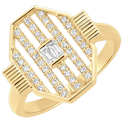 Un majestuoso anillo de oro amarillo de diseño audaz. Líneas paralelas engastadas con diamantes y un brillo central dominado por un corazón engastado con diamantes brillantes. Esta joya captura la luz de manera espectacular con cada movimiento.