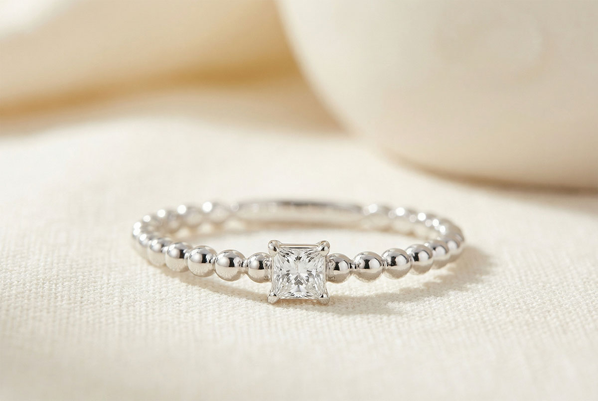 El solitario Burbuja Princesa se compone de un delicado diamante corte Princesa colocado en un anillo de oro blanco burbujeado para un toque de gracia moderna