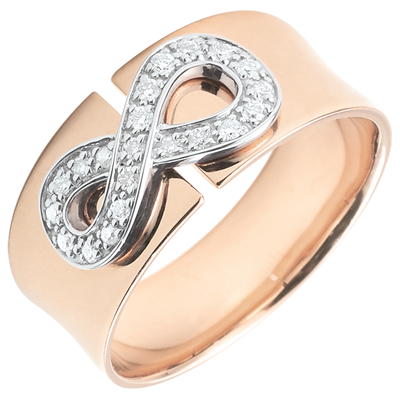 Un signo de infinito en oro rosa engastado con diamantes se sienta en una montura grande y preciosa. Es el símbolo de la eternidad absoluta