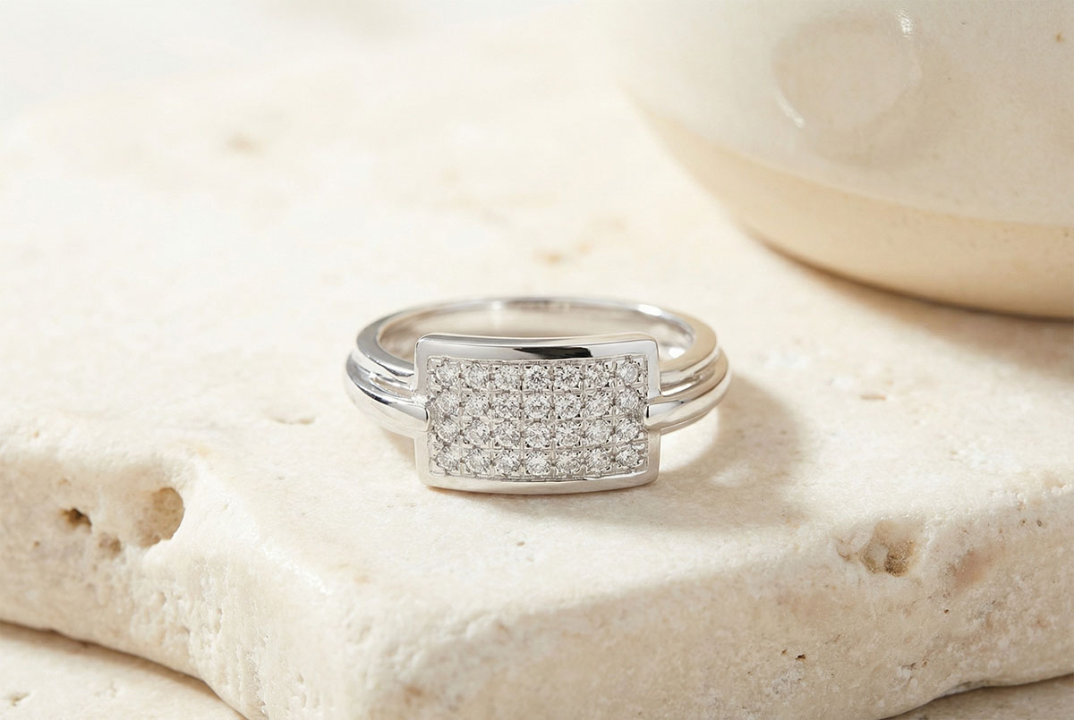 El pavimento geométrico de una placa diamantes, sobrios y gráficos. Un anillo de una gran elegancia y de carácter.