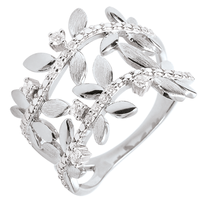 Hojas de oro blanco brillantes y hojas de oro de acabado rugoso hechas a mano se alternan para crear un anillo romántico con 13 diamantes.