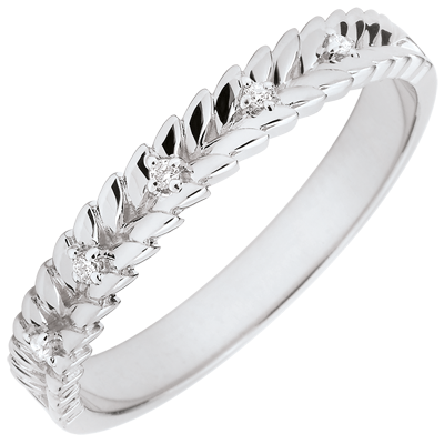 Delicados diamantes se han deslizado en el follaje de oro trenzado de este anillo de oro blanco. Esta joya podrá ser llevada como un anillo o como una alianza romántica y refinada.