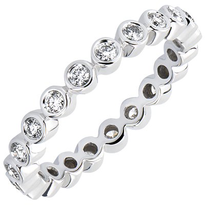 Un Anillo de Matrimonio completamente recubierto por 21 diamantes con engaste en chatón. Un brillo sin igual, inspirado en la luz delicada que se reflejan en las gotas de rocío matinal