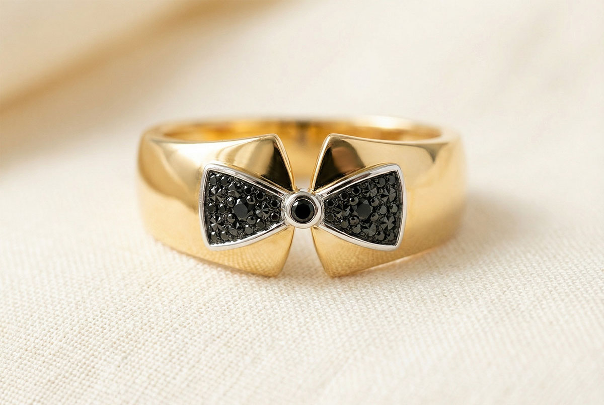Una cinta de oro amarillo es cerrada por un nudo de oro blanco, rodio negro y diamantes negros para cercar su dedo.