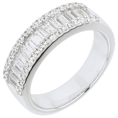 Tres hileras de diamantes, de tallas brillante y baguette, crean un efecto estructurado y sofisticado sobre un arco de Oro Blanco.