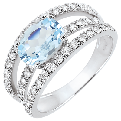 Un montura arquitectónica compuesta de tres anillos de oro blanco y diamantes que hacen brillar el topacio central.