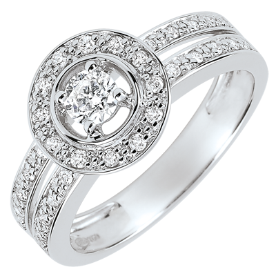 Un diamante central que resalta sobre un anillo doble de oro blanco rodeado de diamantes más pequeños.