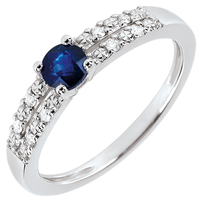 Una pieza que transmite pureza y sencillez. Un anillo de oro blanco y diamantes, coronado por un zafiro central.