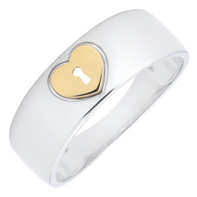 Un corazón de oro amarillo portador de una cerradura en su centro, reina sobre una montura ancha de oro blanco.