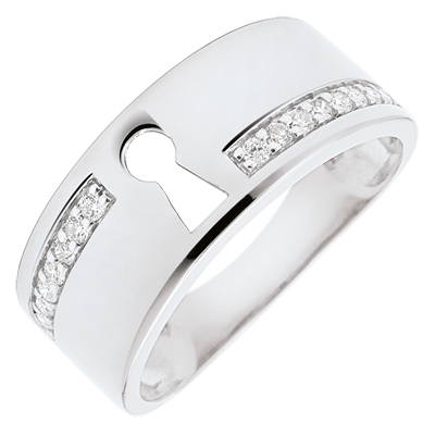 Una cerradura reina esta ancha montura de oro blanco salpicada de diamantes.