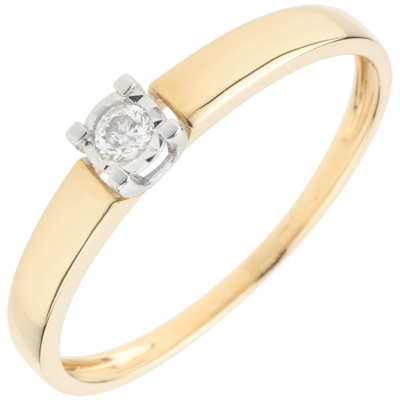 Una montura de oro amarillo lleva un diamante delicadamente flejado por oro blanco cincelado mantenido por 4 uñas cuadradas.