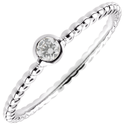 Una miríada de perlas de oro se suceden para acompañar un diamante solitario con engaste de bisel. Un anillo de compromiso moderno y femenino.