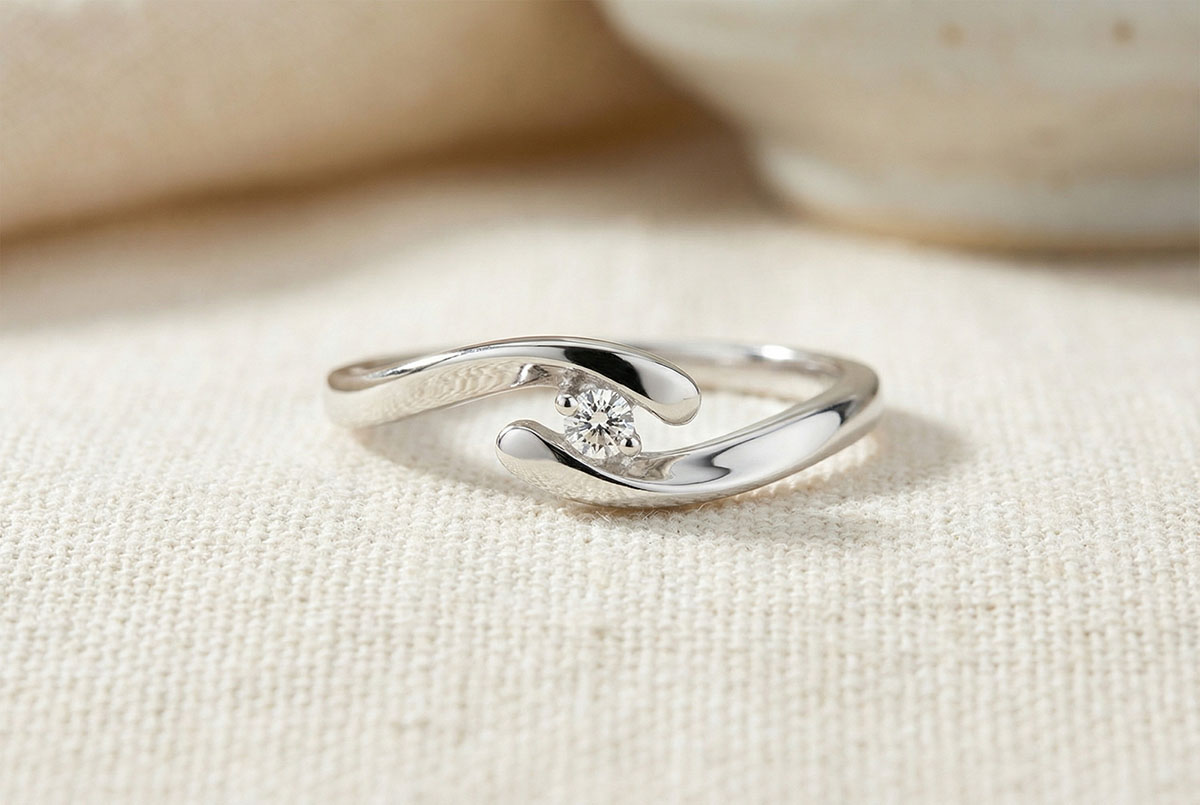 Un diamante solitario brilla en una montura de dos brazos de Oro Blanco.