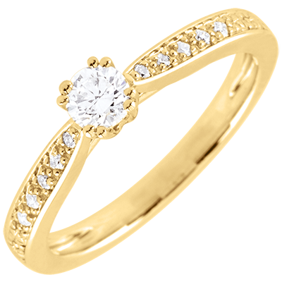 Un diamante solitario engarzado por 8 garras sobre una montura fina cubierta de diamantes.