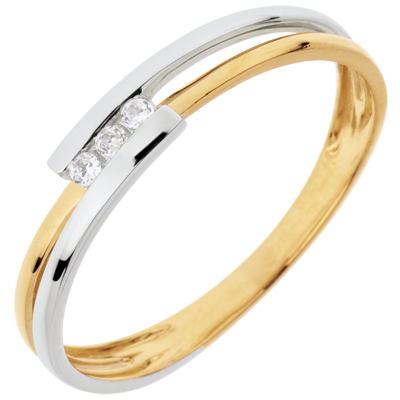 Una trilogía de diamantes montados sobre un aro de Oro Amarillo y abrazados por dos ondas de Oro Blanco.