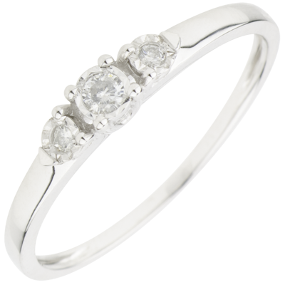Una montura de oro blanco coronada por una trilogía de diamantes delicadamente rodeados de oro blanco.