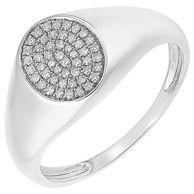 Un Anillo de Sello de oro blanco, cuya parte superior ovalada está generosamente recubierta con 50 diamantes.